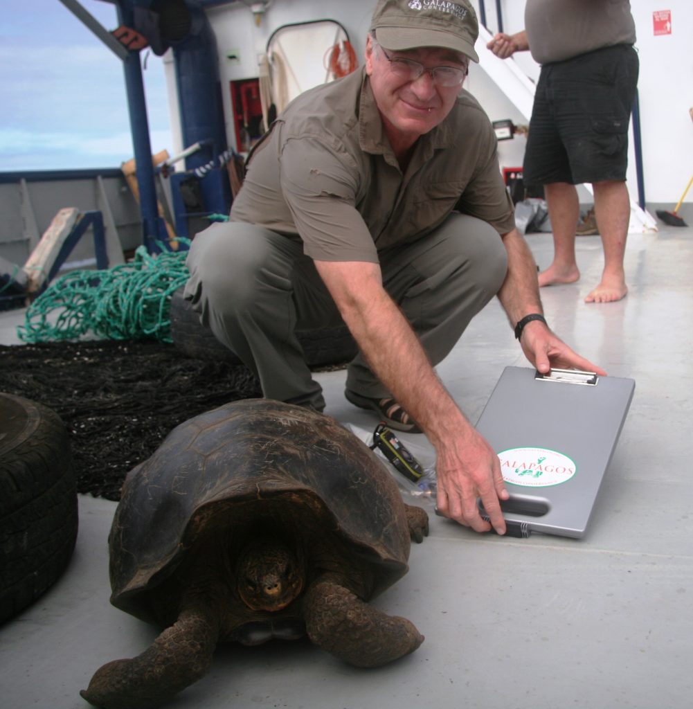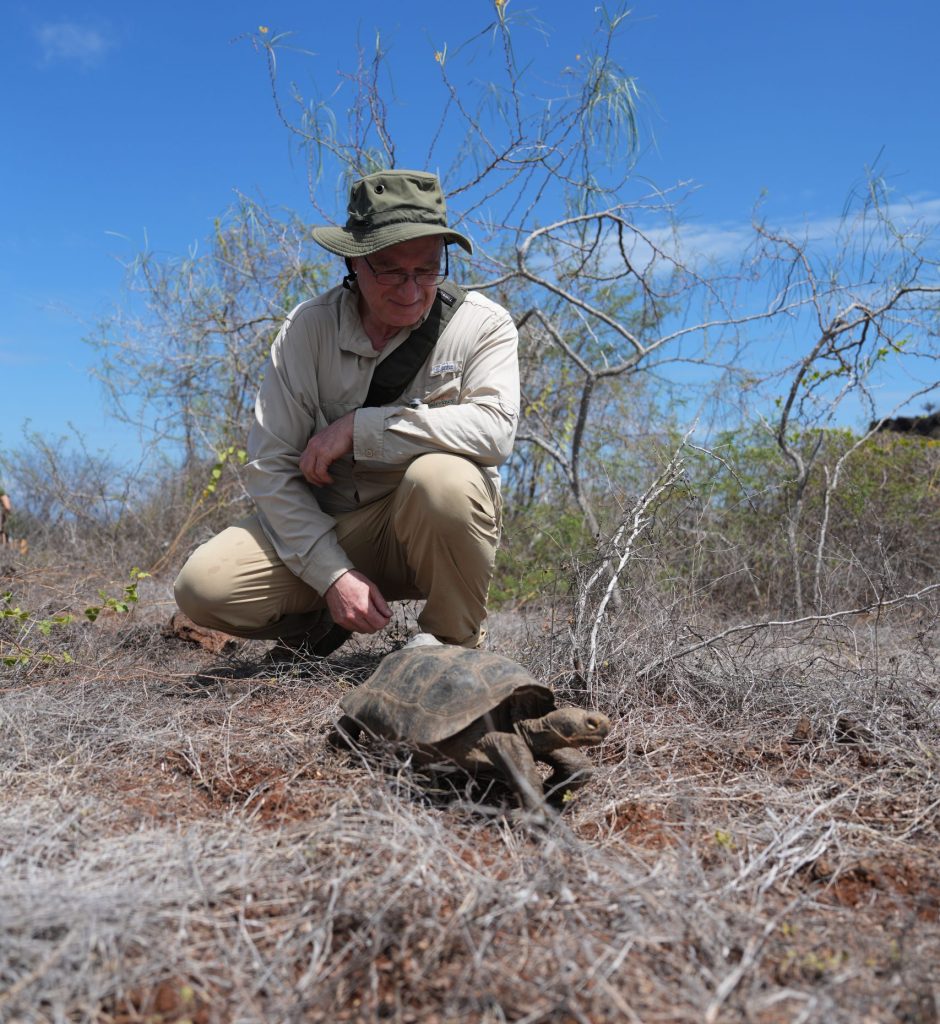 Dr. James Gibbs during the 2026 Floreana tortoise release.
